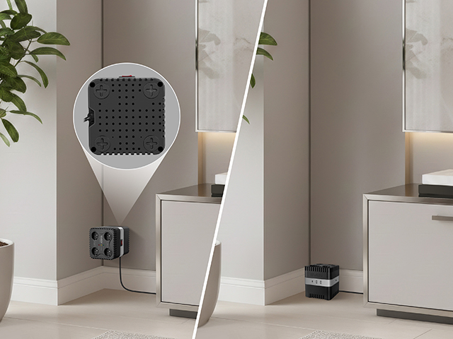 Thanks to four mounting holes on the rear panel, the stabilizer can be conveniently wall-mounted in any orientation, saving valuable floor or desk space. The power cord length is 1.2 meters, and the input plug follows the CEE 7/7 standard.