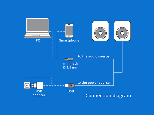 Want to connect your speaker system to a computer or mobile device? It's quick and easy. Just connect your speakers to an audio source using a 3.5 mm mini-jack cable. The system requires power: plug the USB adapter into a wall outlet or use a device's USB port. Enjoy high-quality sound with minimal setup!