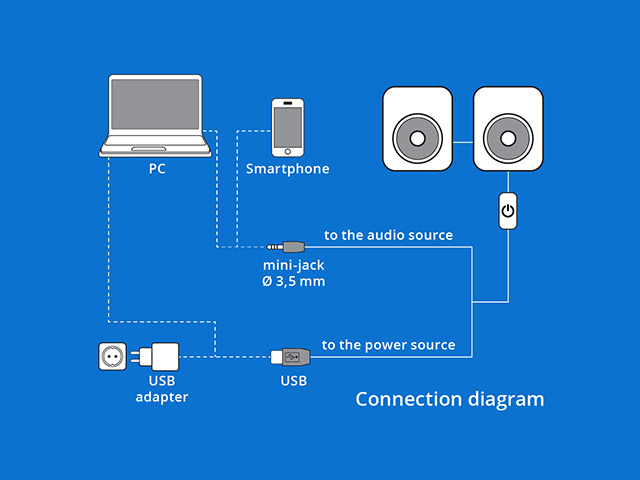 Want to connect your speaker system to a computer or mobile device? It's quick and easy. Just connect your speakers to an audio source using a 3.5 mm mini-jack cable. The system requires power: plug the USB adapter into a wall outlet or use a device's USB port. Enjoy high-quality sound with minimal setup!