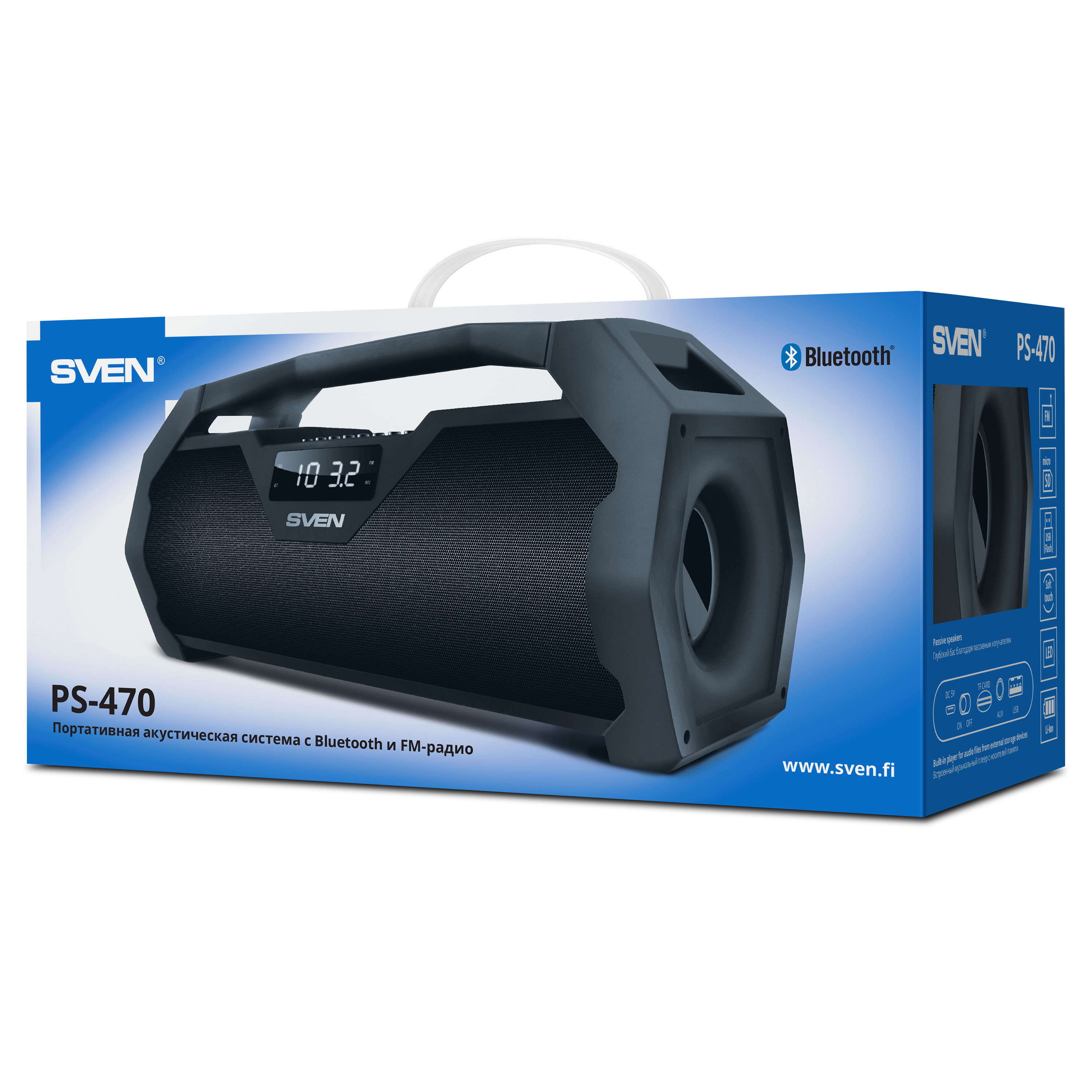 Portable acoustic system SVEN PS-470 offers a broad variety of features. It can playback music from microSD memory cards and USB Flash, supports wired connection to a sound source, as well as can connect to smartphones and tablets via Bluetooth and playback a playlist from mobile devices. Also, it has FM radio. You won't get bored for sure! The front panel has an informative display, showing the operation modes of a device.